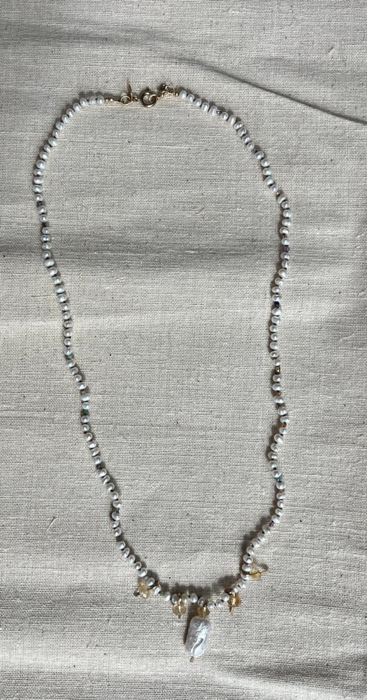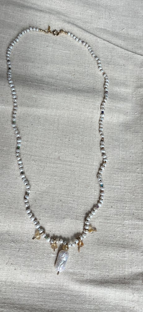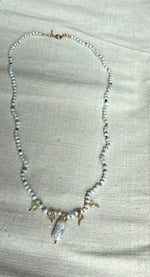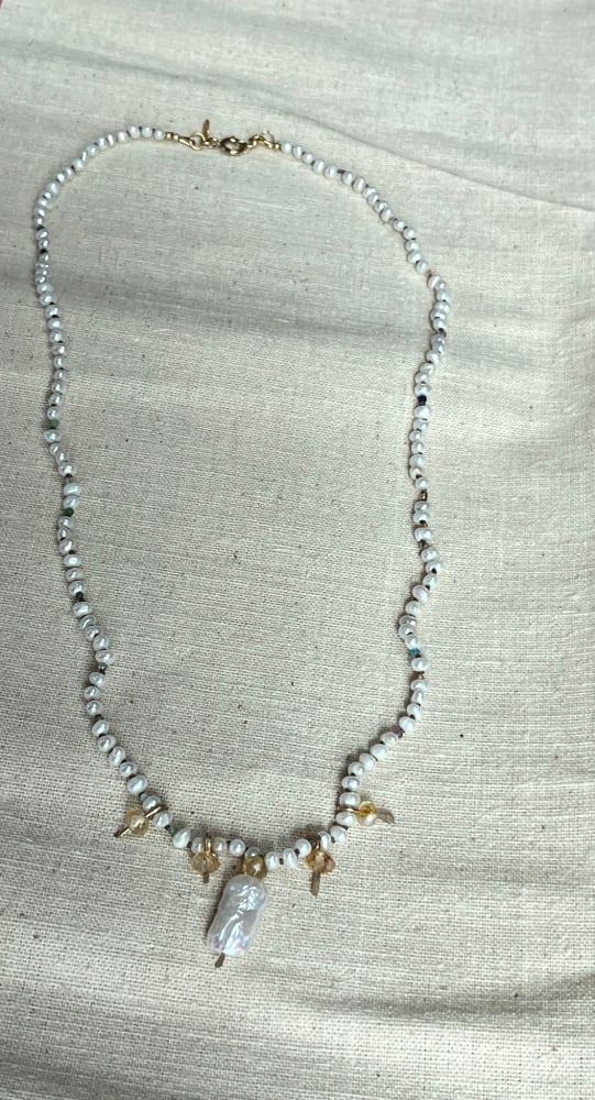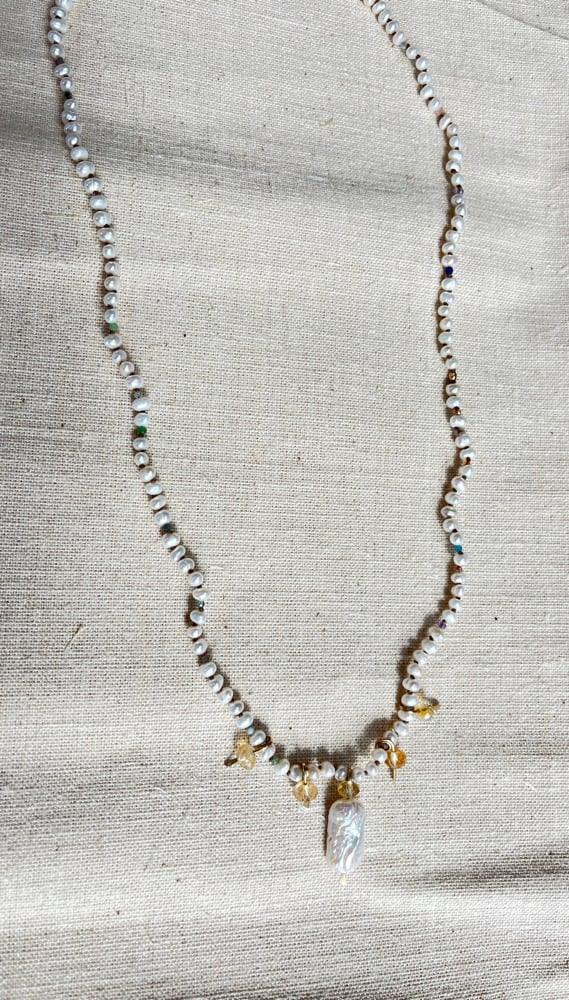 Fresh water pearls and tourmaline on knotted beige silk thread with gold findings and details