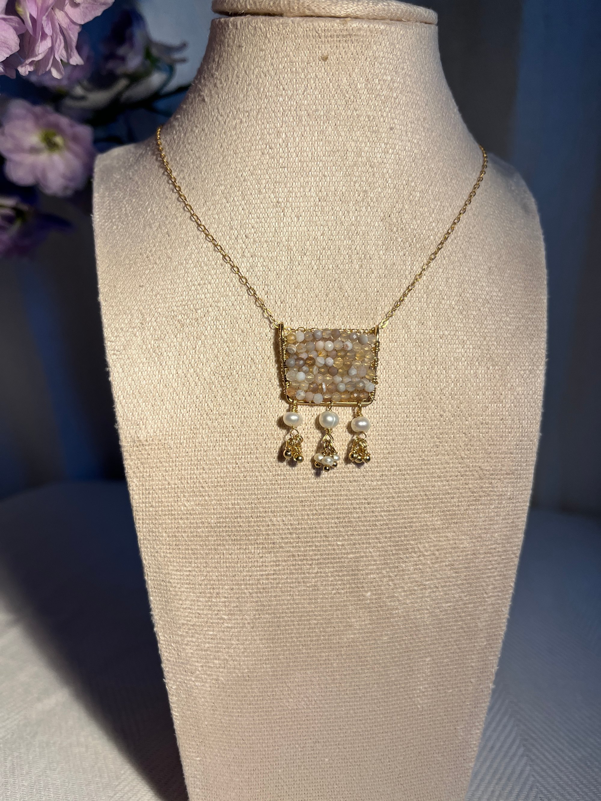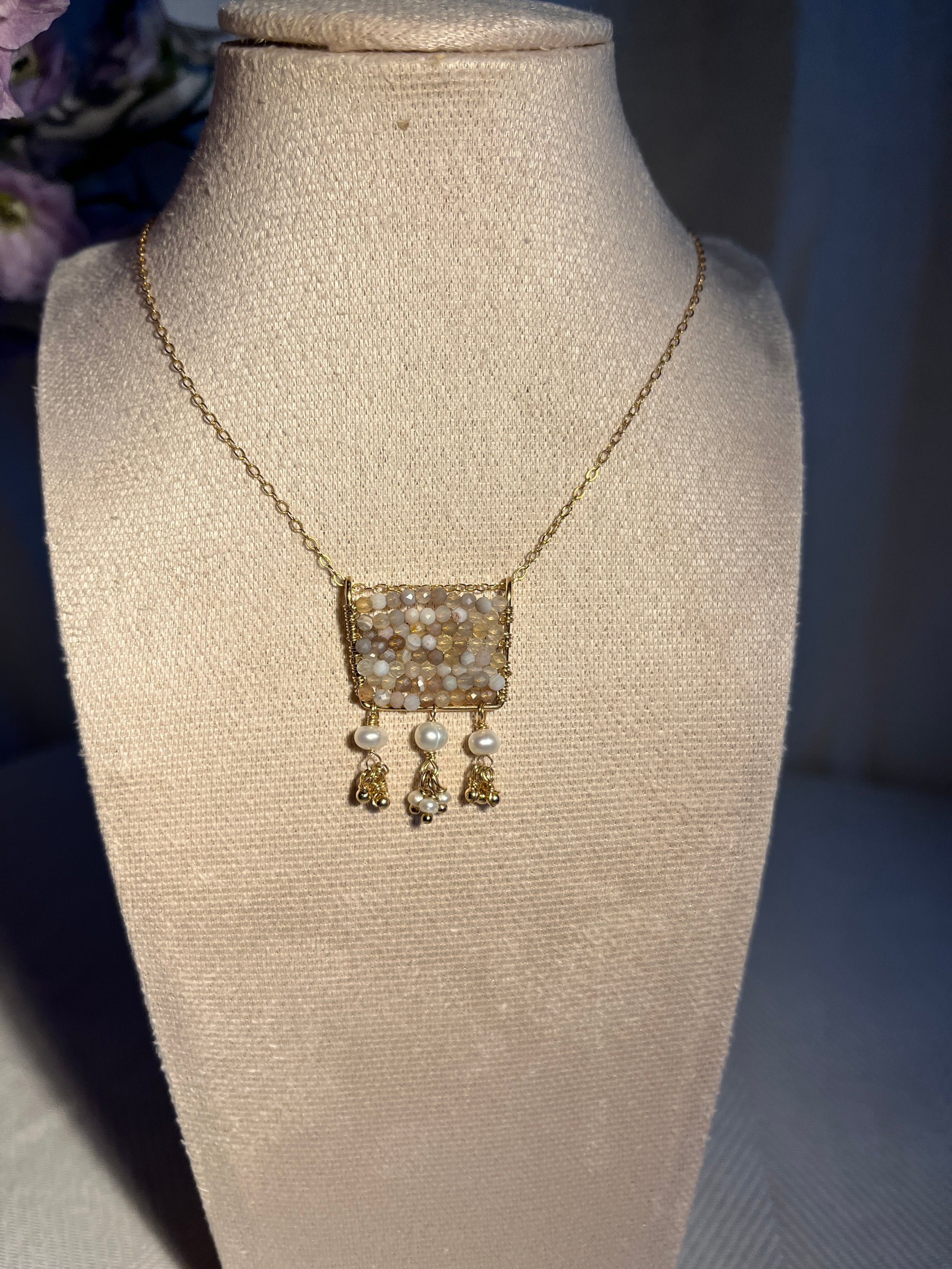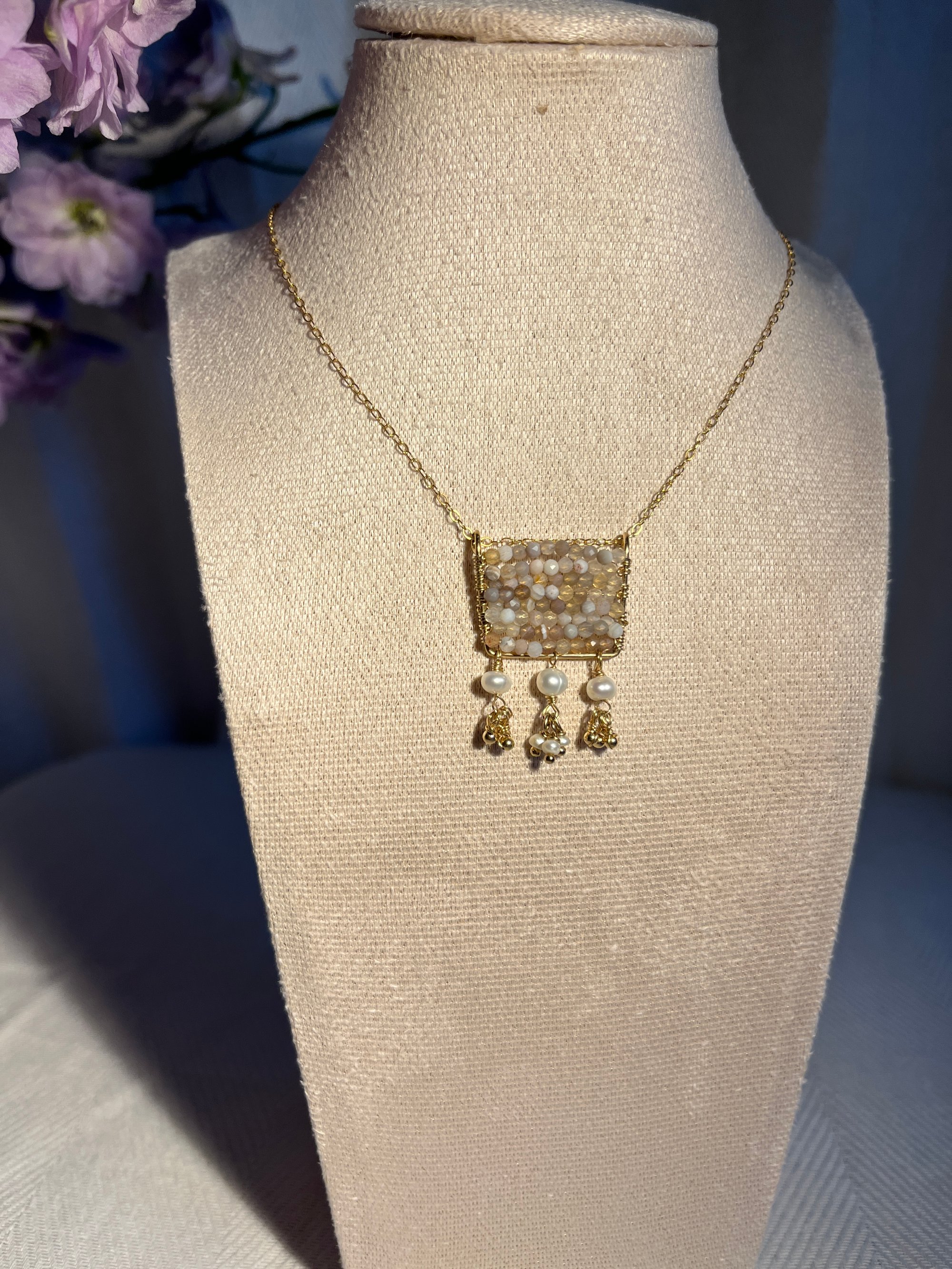 Woven Moonstone beads on gold filled with with tiny freshwater pearl dangle detail